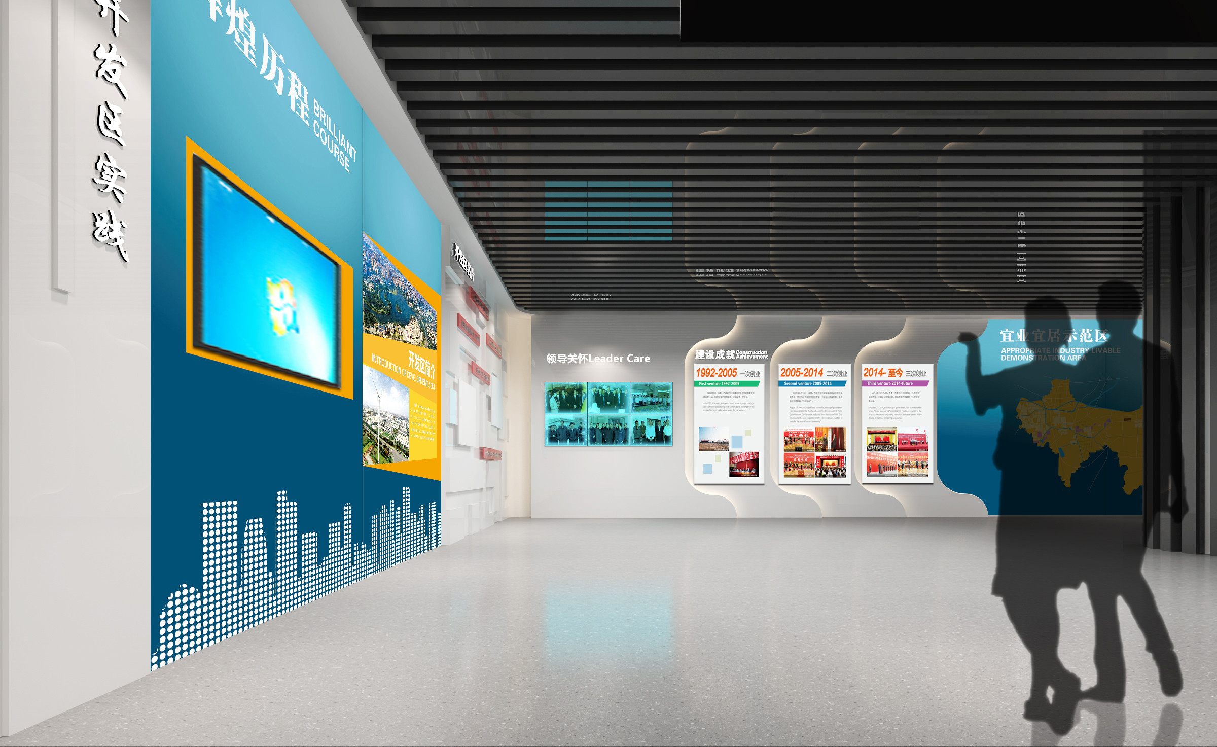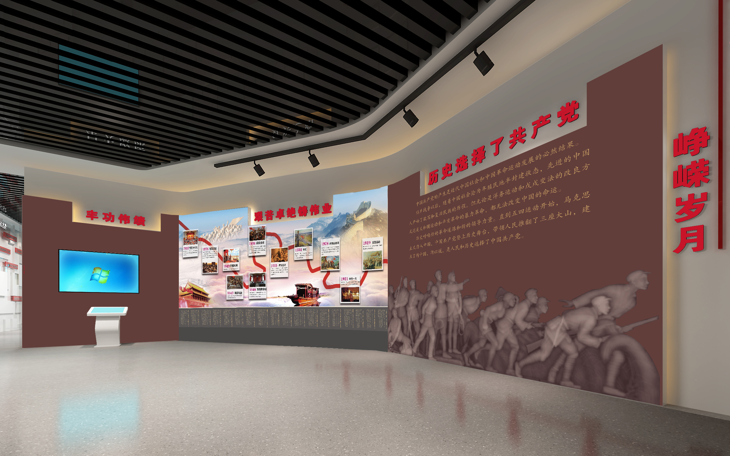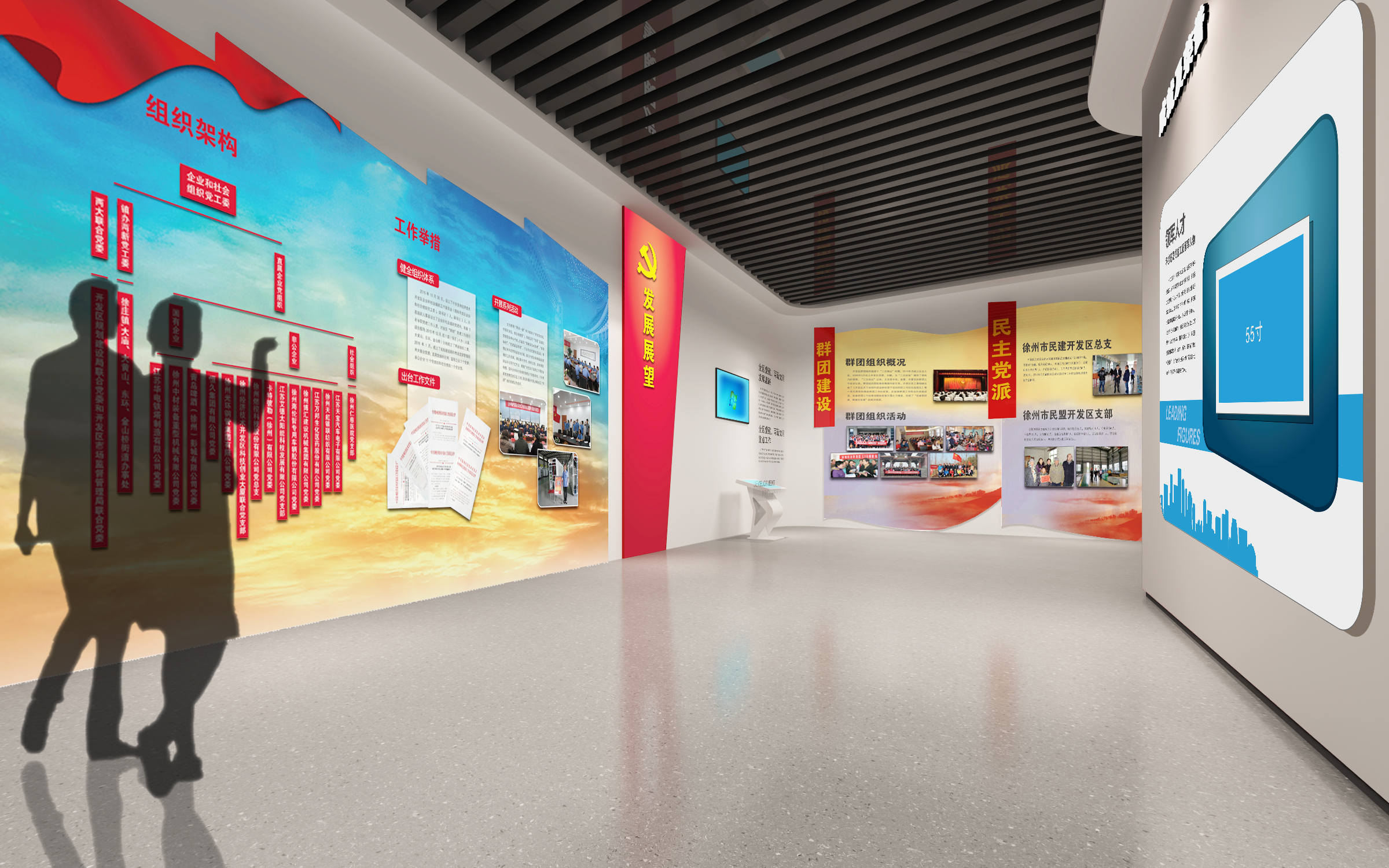 其中布展建筑面積約880平方米,共分為序廳、薪火相傳、開(kāi)發(fā)區(qū)實(shí)踐、黨的建設(shè)、黨群建設(shè)等五部分,用流暢緊湊的參觀流線,系統(tǒng)展示徐州經(jīng)濟(jì)開(kāi)發(fā)區(qū)全面貫徹黨的精神,緊緊圍繞“三次創(chuàng)業(yè)”的發(fā)展戰(zhàn)略,努力建設(shè)“經(jīng)濟(jì)強(qiáng)、百姓富、環(huán)境美、社會(huì)文明程度高”的升級(jí)版的國(guó)家級(jí)開(kāi)發(fā)區(qū)的輝煌前景。另外配套設(shè)置了主題展廳、圖書(shū)閱覽室、黨員“創(chuàng)客”夢(mèng)吧、群團(tuán)活動(dòng)中心、心靈驛站、黨員教育室、遠(yuǎn)程教育室、接待室、咖啡吧、便民超市、辦公室、檔案室、流動(dòng)黨員活動(dòng)站、多功能廳等空間。