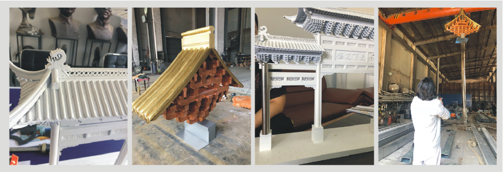 牌樓頂部采用現代材料線框式焊接,通過藝術化加工達到古今碰撞虛實融合的效果。施工團隊與設計師緊密配合,保障了安全有序的現場施工與藝術裝置的落地。