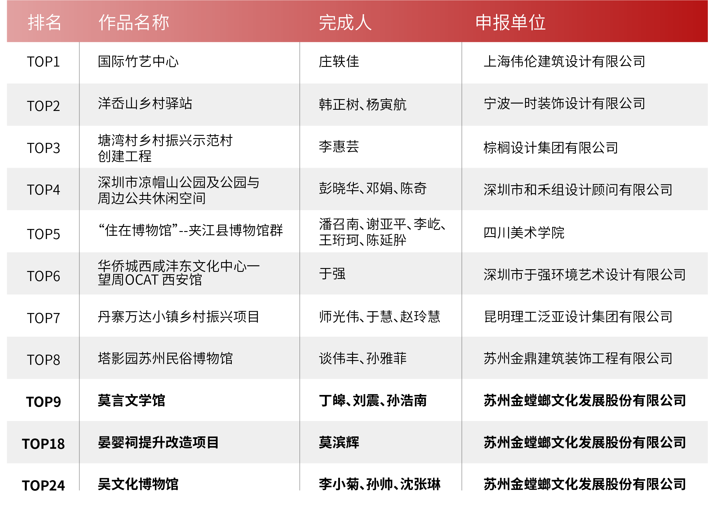2022年鄉(xiāng)村公共文化空間 設(shè)計展示活動 終評結(jié)果于近日公布 金螳螂文化再創(chuàng)佳績 獲評 最佳設(shè)計/運(yùn)營機(jī)構(gòu) 3 個項(xiàng)目獲得 最美鄉(xiāng)村公共文化空間 (空間設(shè)計類) 為深入貫徹落實(shí)習(xí)近平總書記關(guān)于文化和旅游工作重要論述精神,持續(xù)發(fā)現(xiàn)和推出一批“美”“好”“新”的鄉(xiāng)村公共文化空間,引領(lǐng)新時代鄉(xiāng)村公共文化空間構(gòu)建,推動鄉(xiāng)村公共文化服務(wù)高質(zhì)量發(fā)展,助力鄉(xiāng)村振興。 文化和旅游部全國公共文化發(fā)展中心聯(lián)合中國群眾文化學(xué)會、中國建筑裝飾協(xié)會、成都市人民政府、新華網(wǎng)聯(lián)合主辦了2022年鄉(xiāng)村公共文化空間設(shè)計展示活動。 經(jīng)組織專家組進(jìn)行獨(dú)立評審,按照公開、公平、公正原則,研究形成最美鄉(xiāng)村公共文化空間(創(chuàng)新案例類)TOP30,最美鄉(xiāng)村公共文化空間(空間設(shè)計類)TOP30,網(wǎng)絡(luò)人氣項(xiàng)目TOP10,最佳設(shè)計/運(yùn)營機(jī)構(gòu)TOP10,優(yōu)秀組織單位等名單。 以“我是一個講故事的人”為設(shè)計理念,依托紙張的藝術(shù)表現(xiàn)形式,用喚起感官聯(lián)覺的創(chuàng)新展陳形態(tài),將莫言的文學(xué)內(nèi)涵轉(zhuǎn)化為具象的藝術(shù)展示。 充分利用中庭中空的建筑特點(diǎn),依托莫言的文學(xué)特性,引入時間與光影的語言,日光傾瀉帶來無限希望和遐想,就像莫言的文學(xué)作品,用文字突破時空形成的經(jīng)緯限制。 晏嬰祠項(xiàng)目地點(diǎn)位于山東德州齊河縣,是為紀(jì)念春秋時期齊相晏嬰而建的一座仿漢制殿宇式宗廟性建筑,旨在通過宣揚(yáng)晏嬰廉潔、勤勉、愛民、仁政的政治主張,是集教育、學(xué)習(xí)、交流于一體的德政文化教育基地。 晏嬰祠占地面積約30畝,建筑面積3000多平方米,建筑造型奇特,雄偉壯觀。設(shè)計區(qū)域面積分為室內(nèi)880平方,庭院連廊1200平方。展示主題以祭祀為中心功能,以晏嬰故事為重點(diǎn),彰顯晏嬰的品質(zhì)和功績,突出歷史評價及對當(dāng)今德政教育的意義。 蘇州市吳中區(qū)博物館,又名吳文化博物館,位于蘇州市吳中區(qū)澹臺街9號。博物館占地面積8500平方米,擁有6800件吳地珍貴文物。 金螳螂文化的設(shè)計團(tuán)隊(duì)以“人文吳中,美麗太湖,詩意江南”為線索,通過靈活多變的闡釋體系,清新雅致的空間氛圍,富于創(chuàng)造性的表現(xiàn)手法,對吳文化的演變脈絡(luò)、風(fēng)雅內(nèi)涵,以及吳地的美麗風(fēng)物、雅頌傳承進(jìn)行系統(tǒng)而深刻的展示。 金螳螂文化成立于2001年,是國家高新技術(shù)企業(yè),在北京、上海、南京、西安、重慶等地均設(shè)有分支機(jī)構(gòu)。 公司以策劃設(shè)計創(chuàng)意為核心,科技、文化、藝術(shù)跨界融合,為各類客戶提供空間環(huán)境藝術(shù)策劃,創(chuàng)意設(shè)計、開發(fā)、布展整體解決方案,形成了以博物館、科技館,城市主題文化館、美術(shù)館、企業(yè)文化館、文旅景區(qū)、歷史街區(qū)、特色小鎮(zhèn)等為主要內(nèi)容的業(yè)務(wù)體系。 △ 金螳螂文化總部大廈設(shè)計效果圖,預(yù)計2024年建成 從江南水鄉(xiāng)到三秦大地,金螳螂文化詮釋空間故事,打造了數(shù)十個全國及各省市重點(diǎn)文化項(xiàng)目,收獲了眾多設(shè)計、施工類獎項(xiàng),得到了業(yè)主認(rèn)可,塑造了“創(chuàng)新質(zhì)造”的行業(yè)口碑。